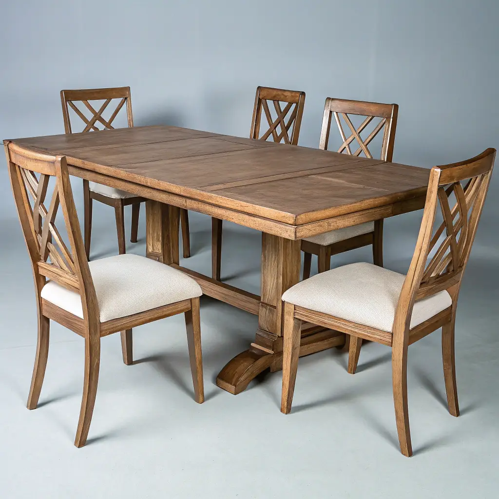 Este elegante juego de mesa de comedor incluye una mesa espaciosa y sillas a juego, fabricadas con madera de alta calidad con un acabado pulido. El diseño es funcional y elegante, adecuado para comidas familiares y para recibir invitados. Las sillas cuentan con una cómoda amortiguación y un aspecto contemporáneo. Una excelente adición a cualquier área de comedor.
